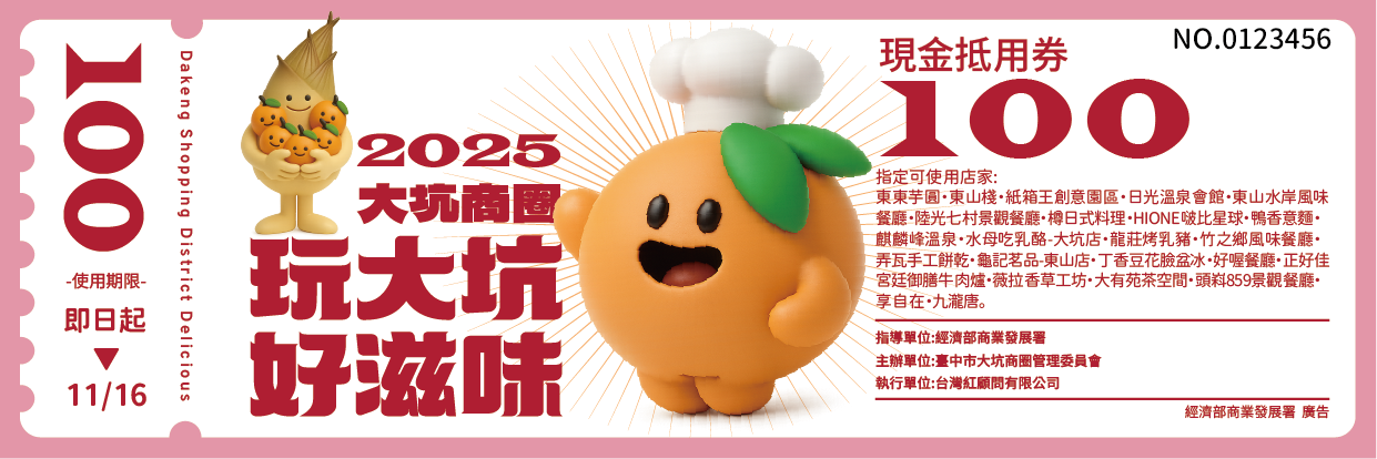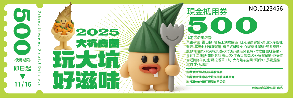 今年我們延續這份美食傳統,再次推出全新的【2025大坑好滋味券】,限量400份,定價1500元、只要800元就能帶回家。這不僅是一份高CP值的餐券,更是大坑商圈送給消費者的誠意回饋。