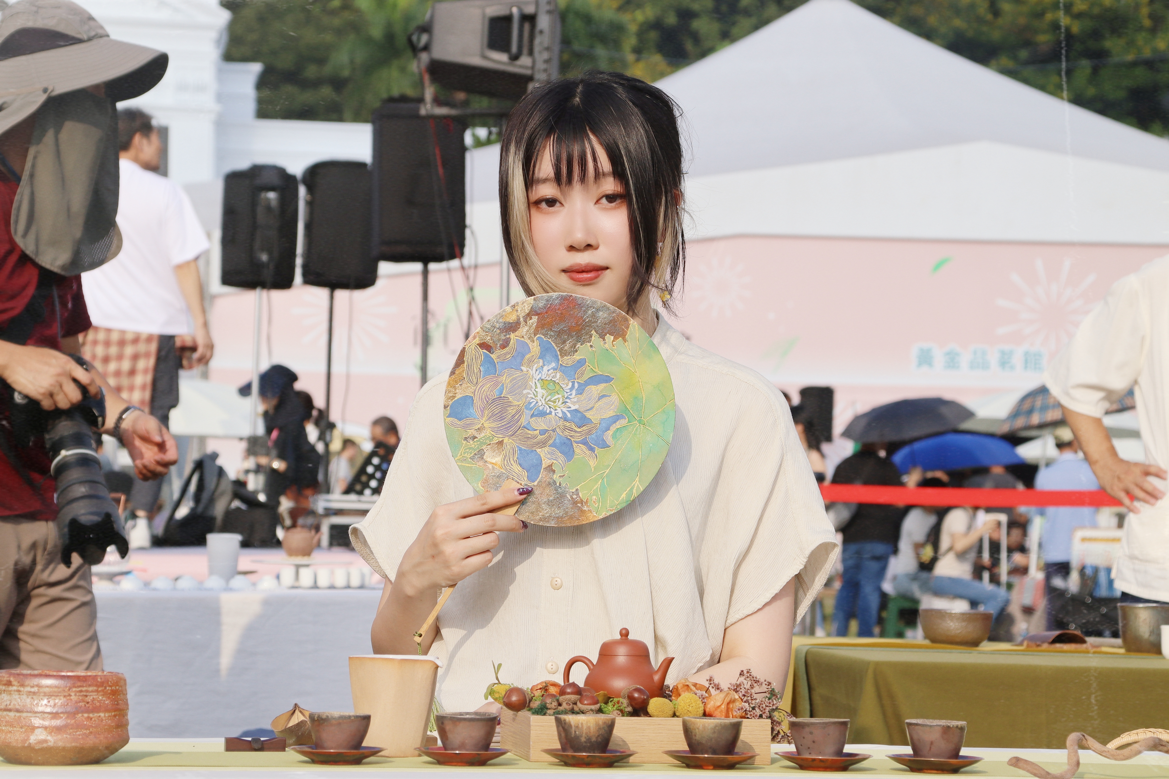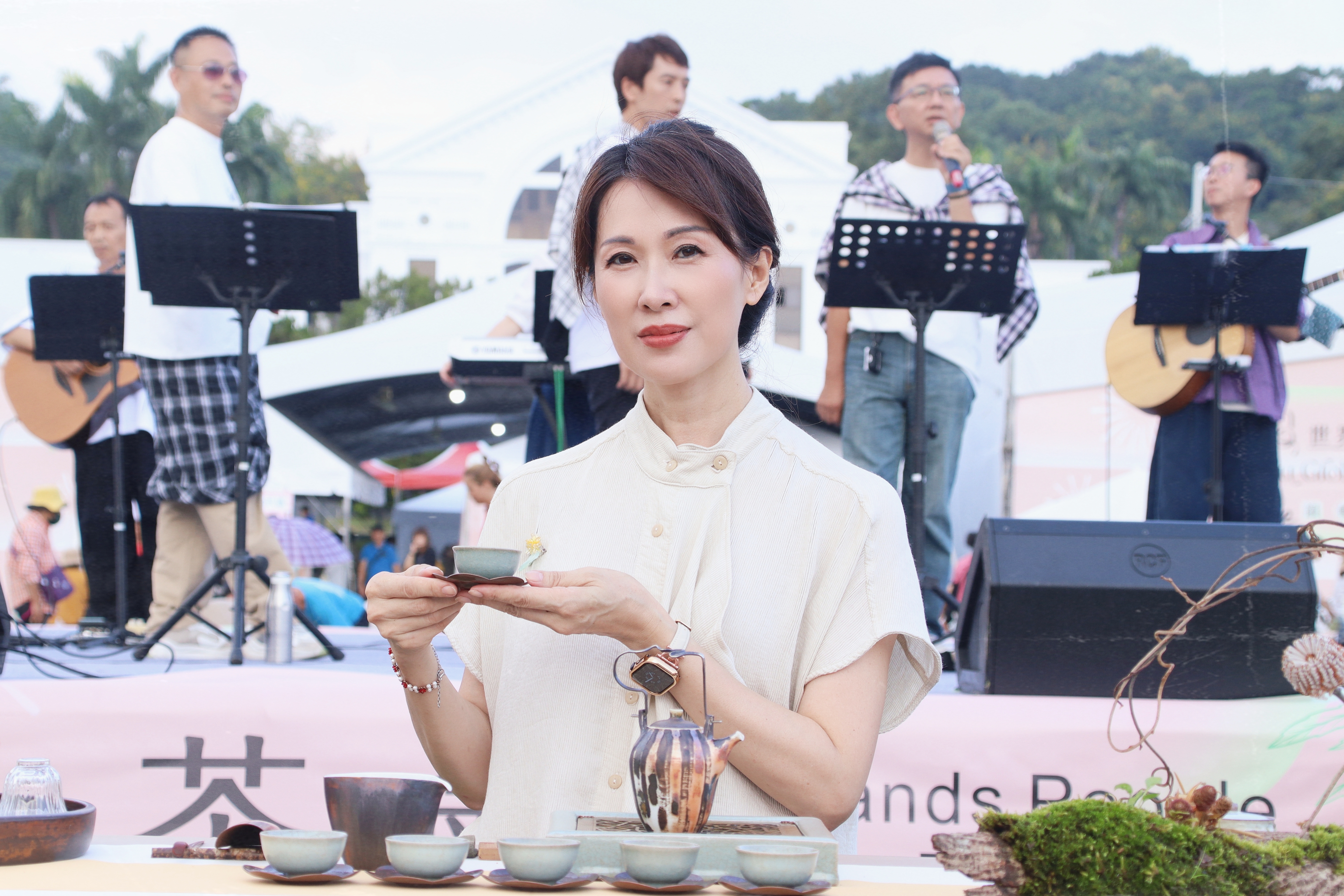 今年茶席數高達350席,茶席主人中有年紀最小的茶人,也有年紀最大的茶人及三代同堂的茶人家庭,大家一起坐在青青草原泡ㄧ壺好茶,青茶、烏龍茶各展茶香,畫面悠閒溫馨。