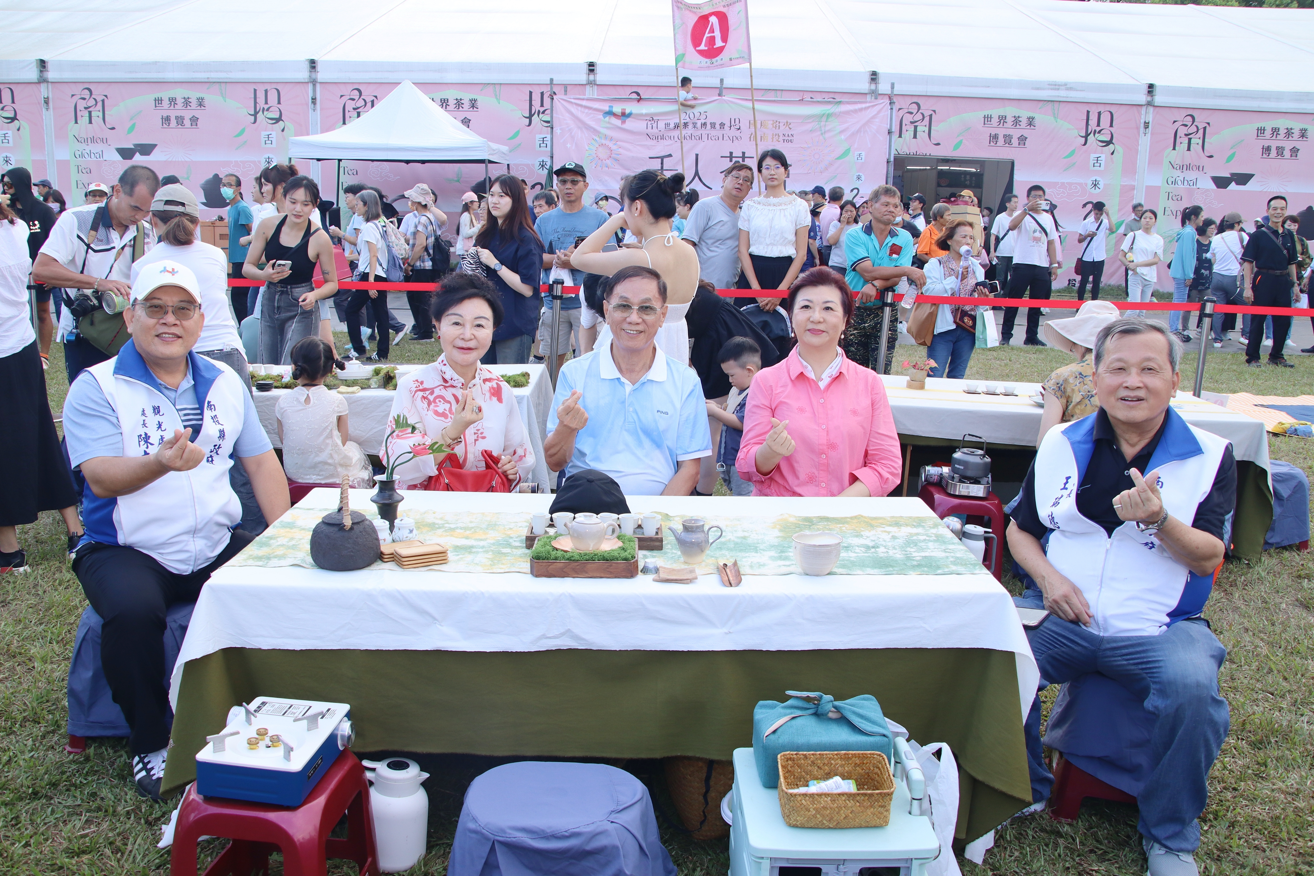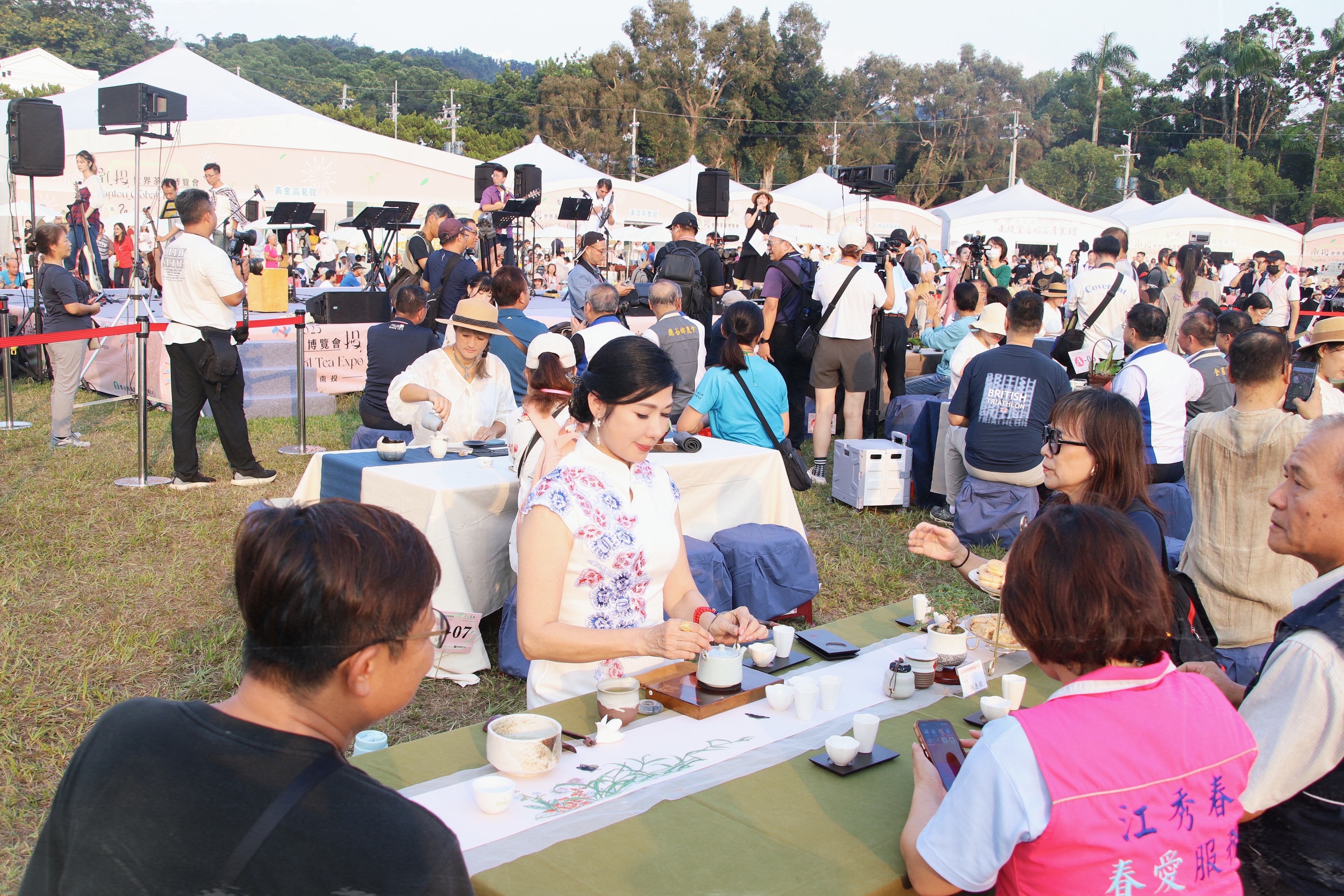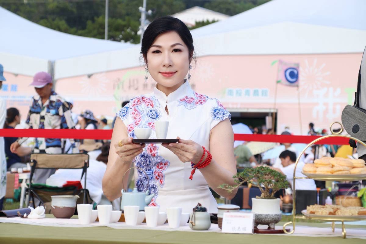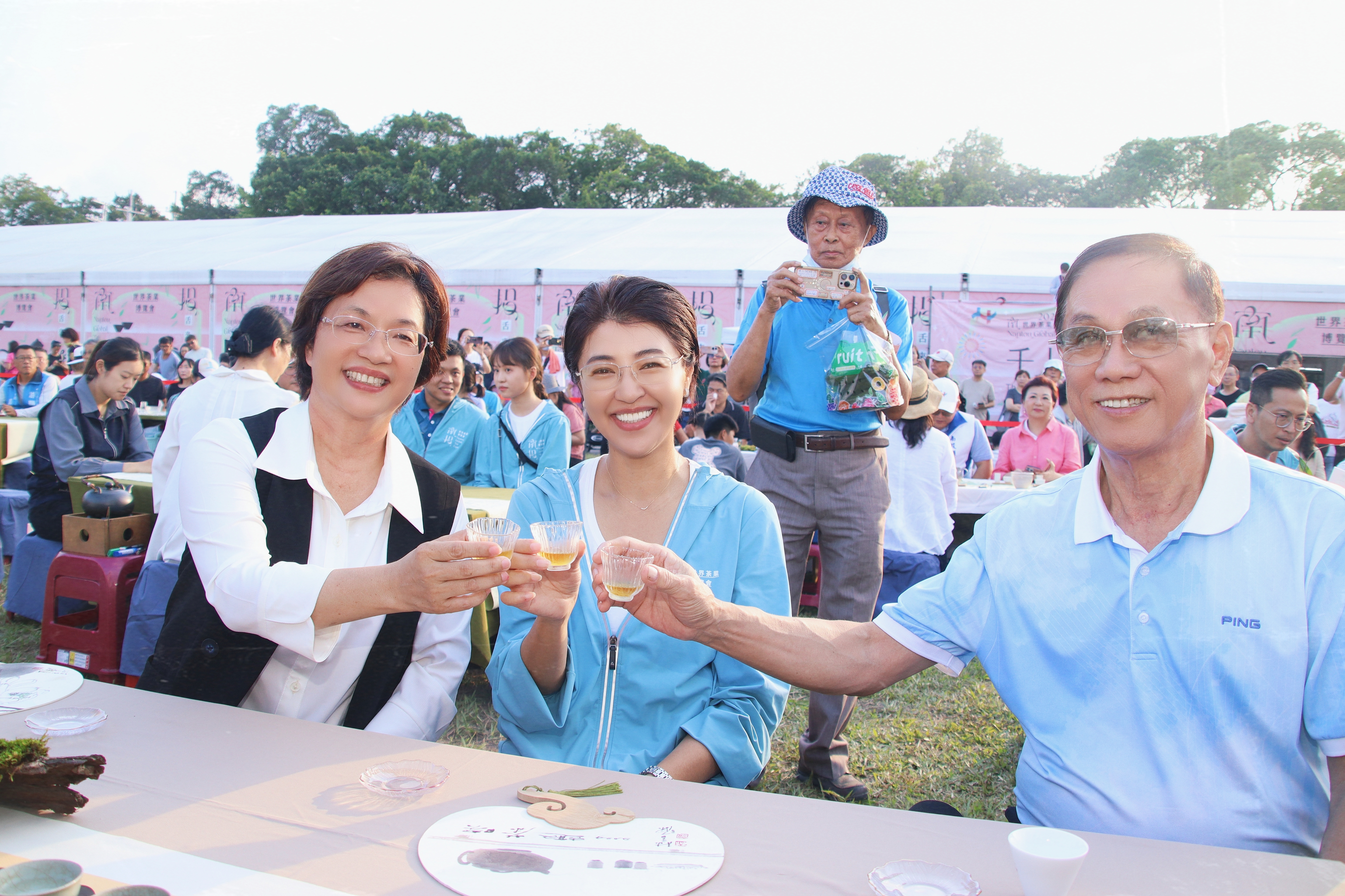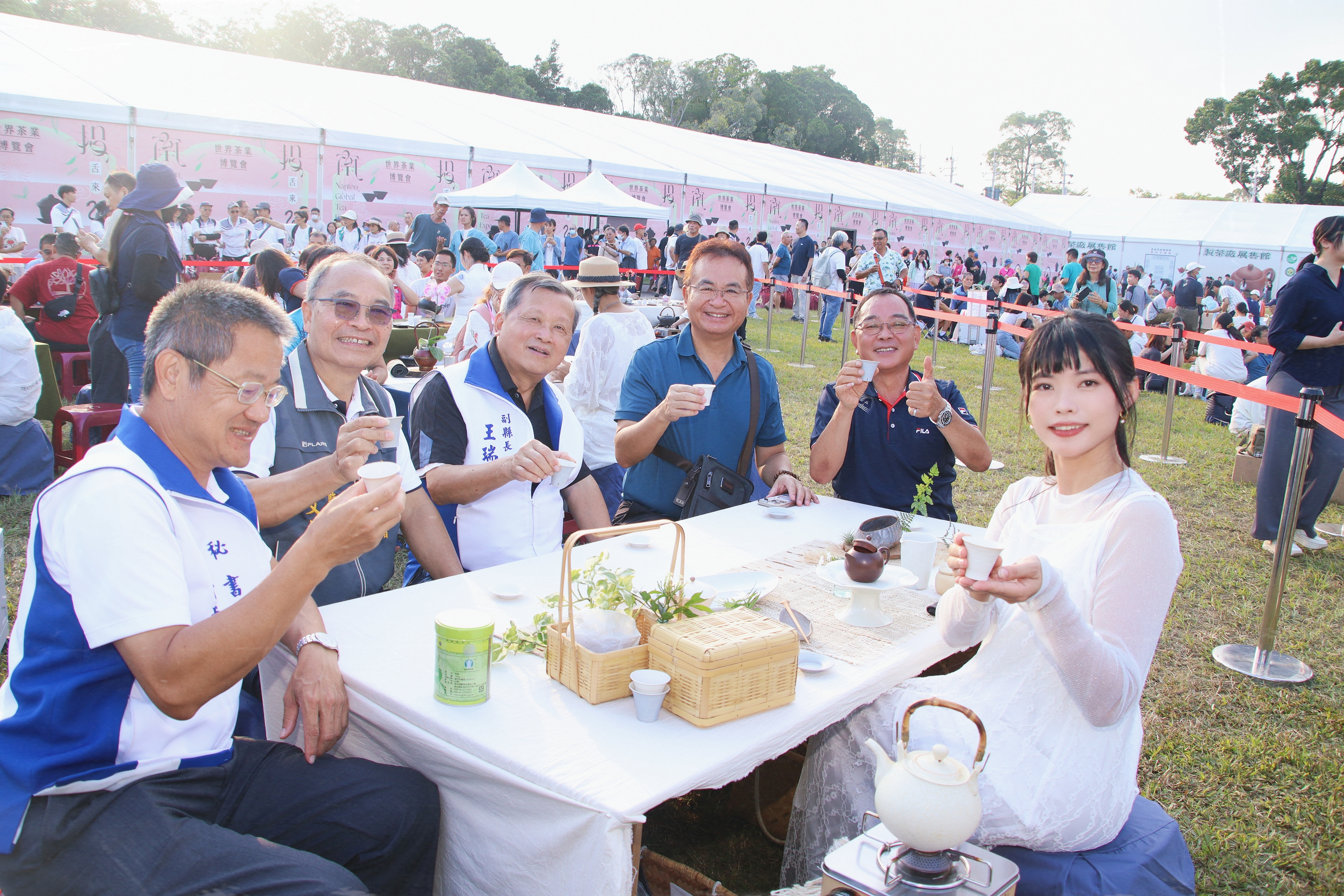 南投世界茶業博覽會最吸睛的活動-千人茶會6日下午在中興大操場盛大登場,350席各具特色的茶席熱情迎賓,縣長許淑華偕同彰化縣長王惠美、縣議員林儒暘、前縣長林明溱及嘉賓們,在夕陽下與來自各地的愛茶人士齊聚青青草原,品茶看表演,體驗千人茶會視覺、聽覺、嗅覺三重享受。