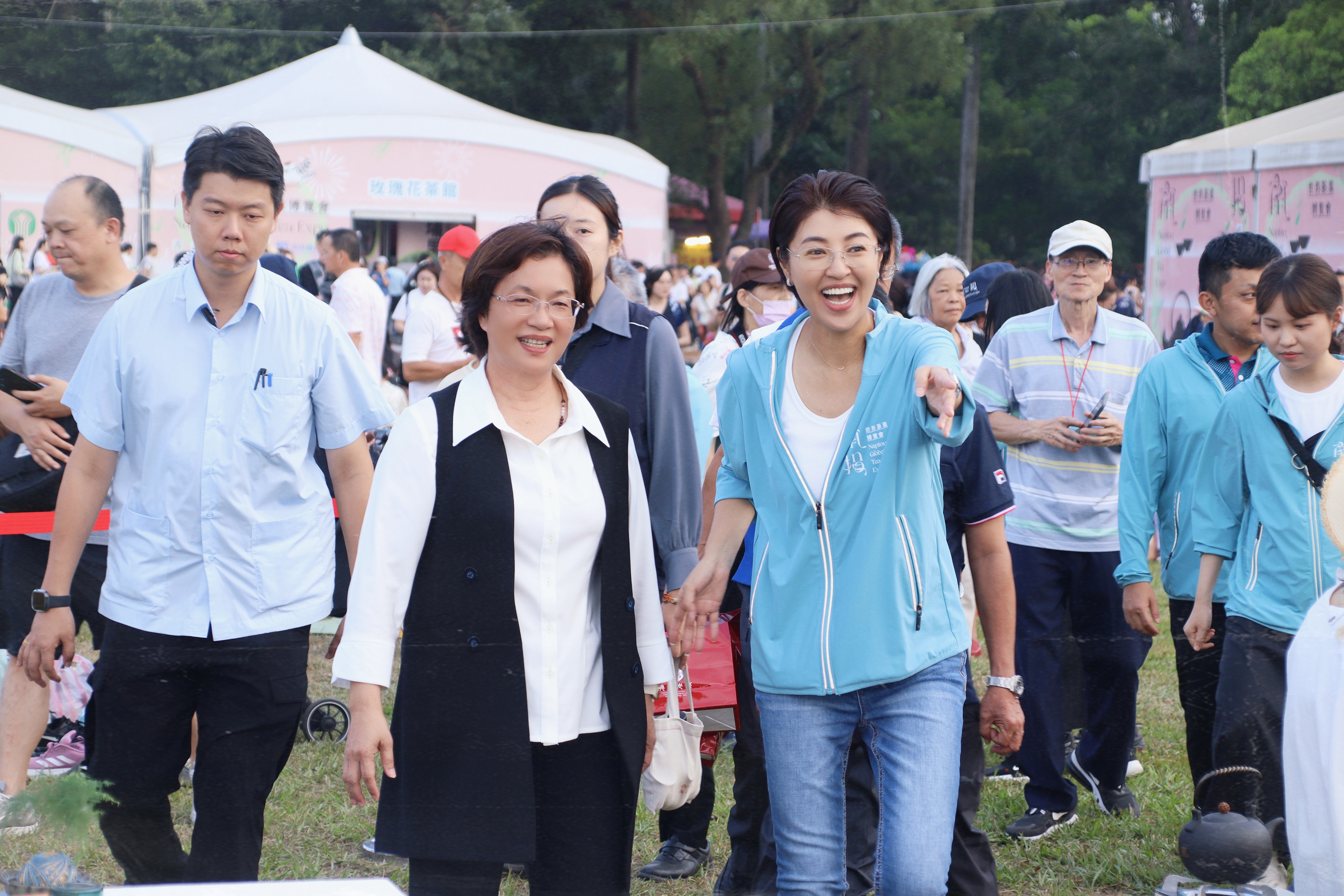 許縣長表示,感謝彰化縣長王惠美特別來參觀茶博會及參與千人茶會,接下來就是國慶連假,希望藉由互相交流,訊息合作,讓所有的遊客可以就國慶連假行程早做規劃;例如在9月到11月期間是消費好康月,只要在南投消費滿500元就可來參加抽獎,彰化縣也有類似活動。此次王縣長特別來為攤商加油打氣外,也藉此盛會行銷中部觀光及彰化縣未來將推動的活動,提供全國各地好朋友在國慶連假更好的規劃參考。