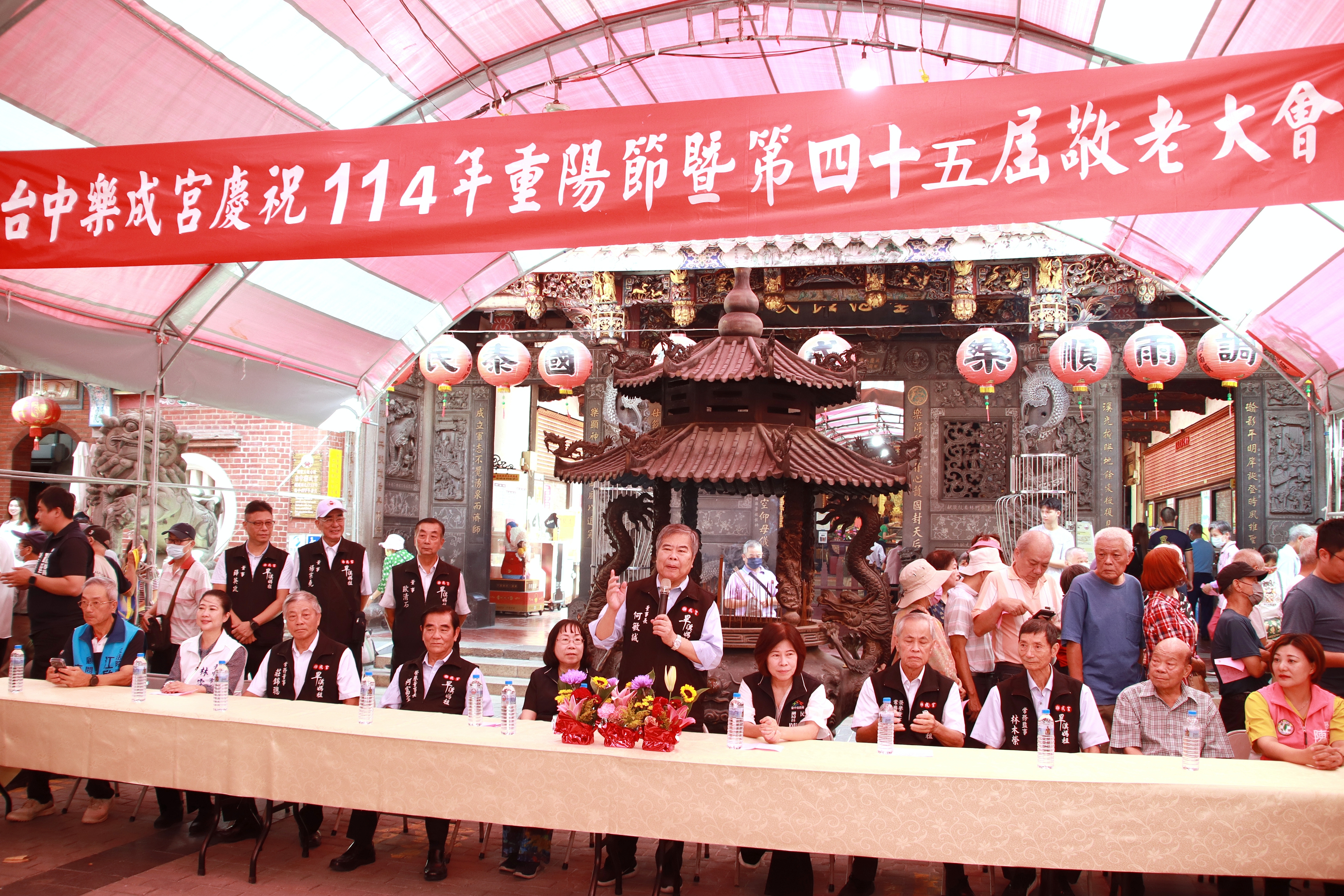 台中樂成宮秉持「老吾老以及人之老」宏揚敬老文化,感恩長者過去對家庭、社會、國家的貢獻,功不可滅,沒有他們過去的努力,就沒有後代子孫的豐衣足食,敬老實質是對老人過去辛勞的一種精神回報,更以媽祖慈悲、關懷及崇敬的態度來舉辦重陽敬老大會已屆滿44年。