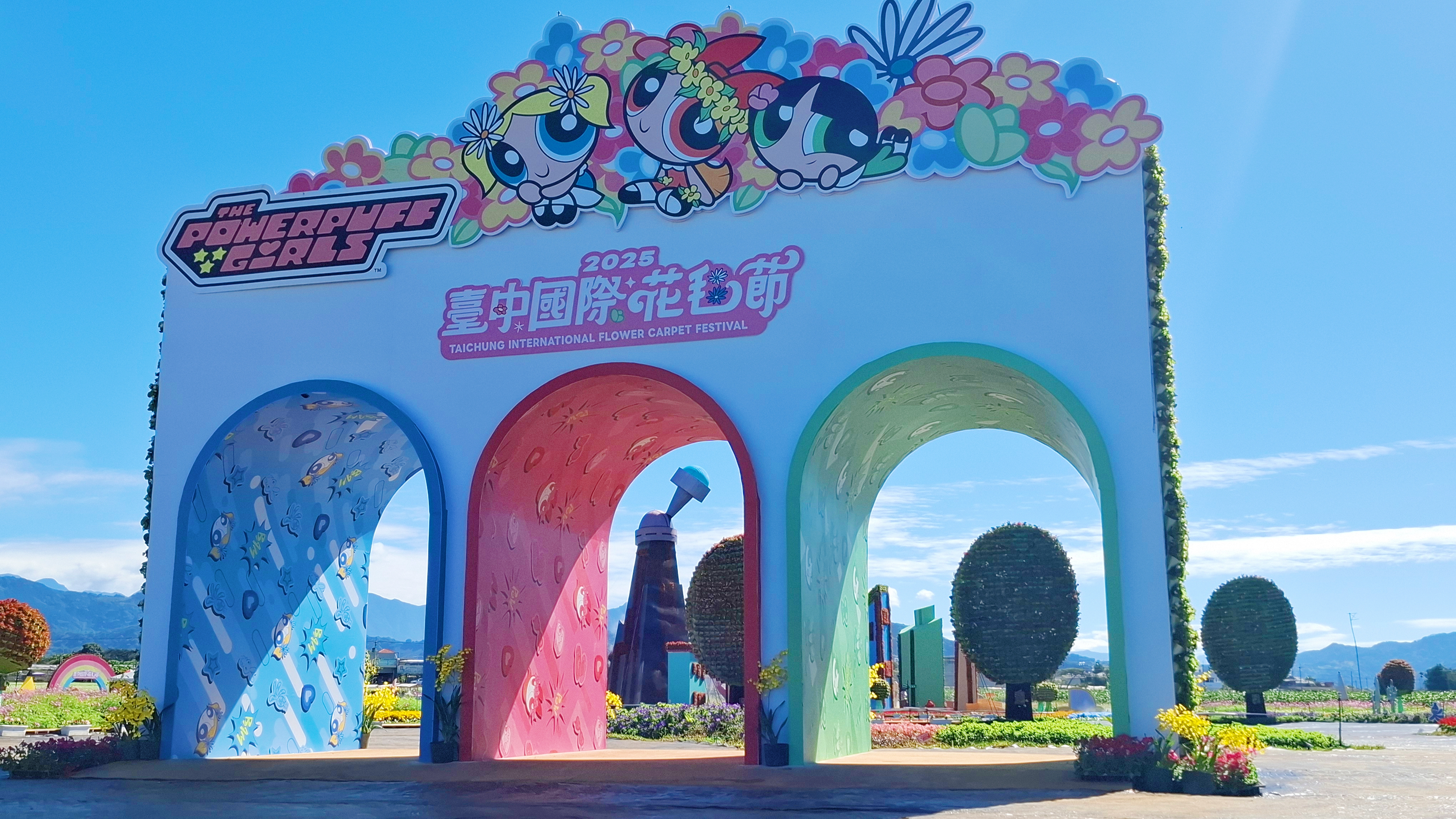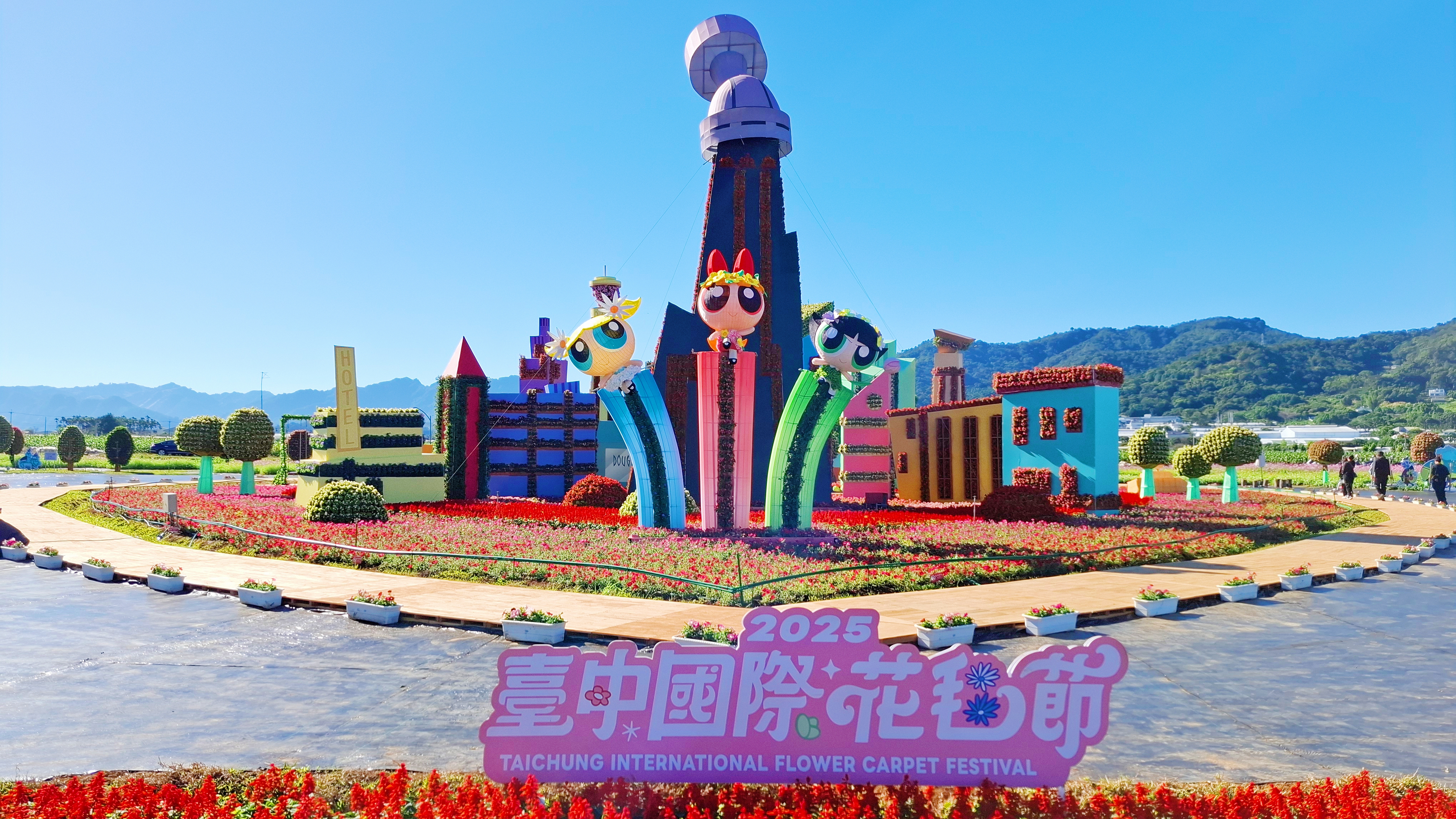 台中市政府副秘書長張大春今日蒞臨花毯節開箱記者會,啟動儀式一開始,飛天小女警偶裝驚喜登場,帶領現場觀眾開啟一場視覺饗宴。現場共有15個裝置藝術,還有許多隱藏角色元素等大家來探索!張副秘書長表示,今年的主花毯為歷屆最大,高18米、直徑60米,其中,以魔人啾啾的基地為裝置的最高點。主要裝置每日每半小時自動展演一次,融合泡泡與水霧效果,搭配機械動態,營造奇幻氛圍。不僅如此,主花毯內還設置以動畫中經典場景為靈感的裝置,像是盪鞦韆、甜甜圈店等人氣打卡點,還能讓大小朋友能親身走入其中探索與拍照,留下美好回憶。