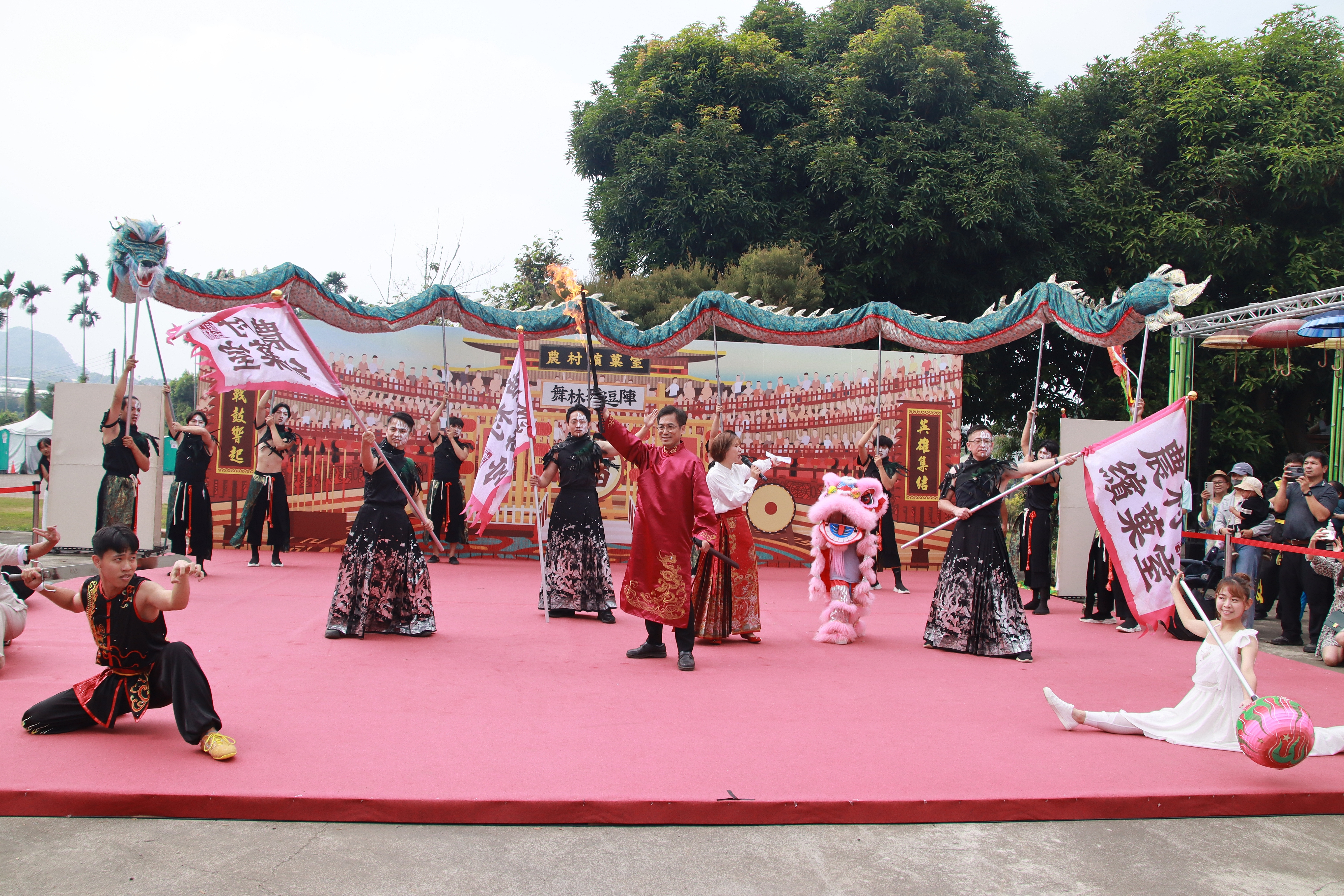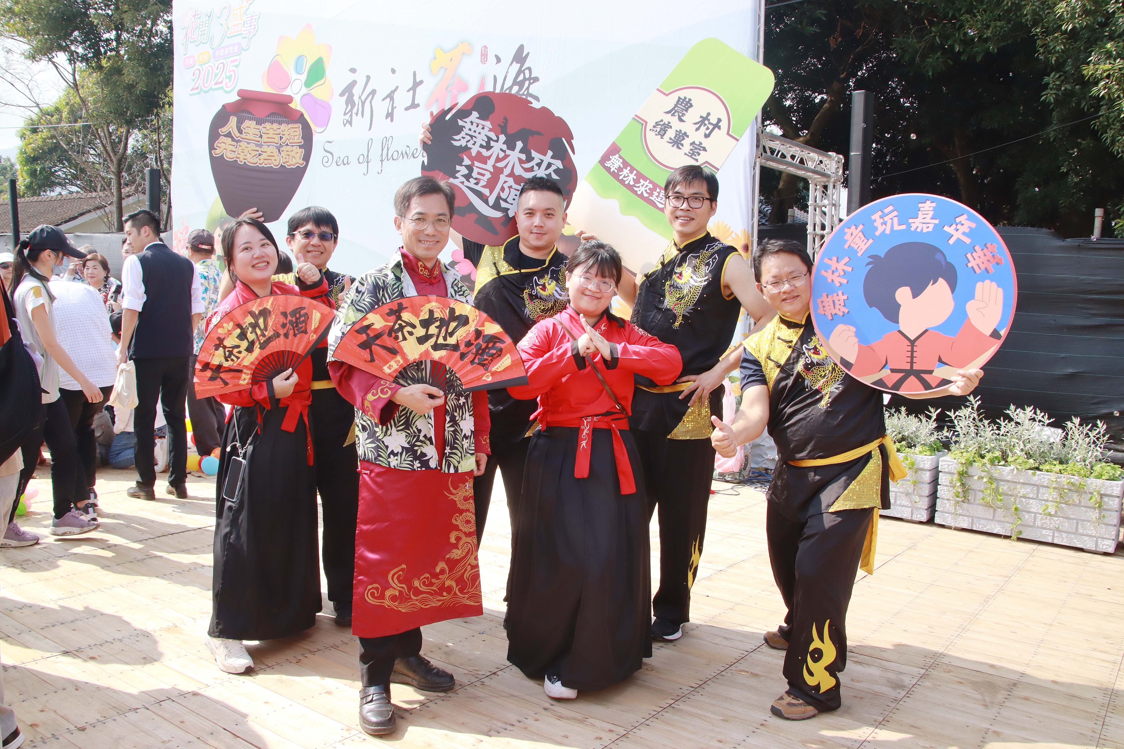今年展館以「武林客棧」為創意概念,融合農村文化與武俠江湖元素,從展館外觀到互動體驗全面升級。懷舊桌椅、古早攤車服務台與復古街機重現農村市街風情,民眾可體驗武林變裝,一秒變身大俠拍出最俠氣十足的造型。戶外還設有「武林擂台」、「客棧老街」、「洋傘廊道」等拍照熱點,讓賞花與打卡一次滿足。開幕式以鼓聲揭幕,來自苗栗的舞空術劇團以武術結合劇場的表演象徵農村精神的剛柔並濟;隨後由新社中和國小KidOpera劇團帶來精彩的扮仙戲《大三仙會》與歌仔戲《盤絲洞》,融合民俗與藝術的,重現古早江湖熱鬧氛圍,掀起全場高潮掌聲不斷。