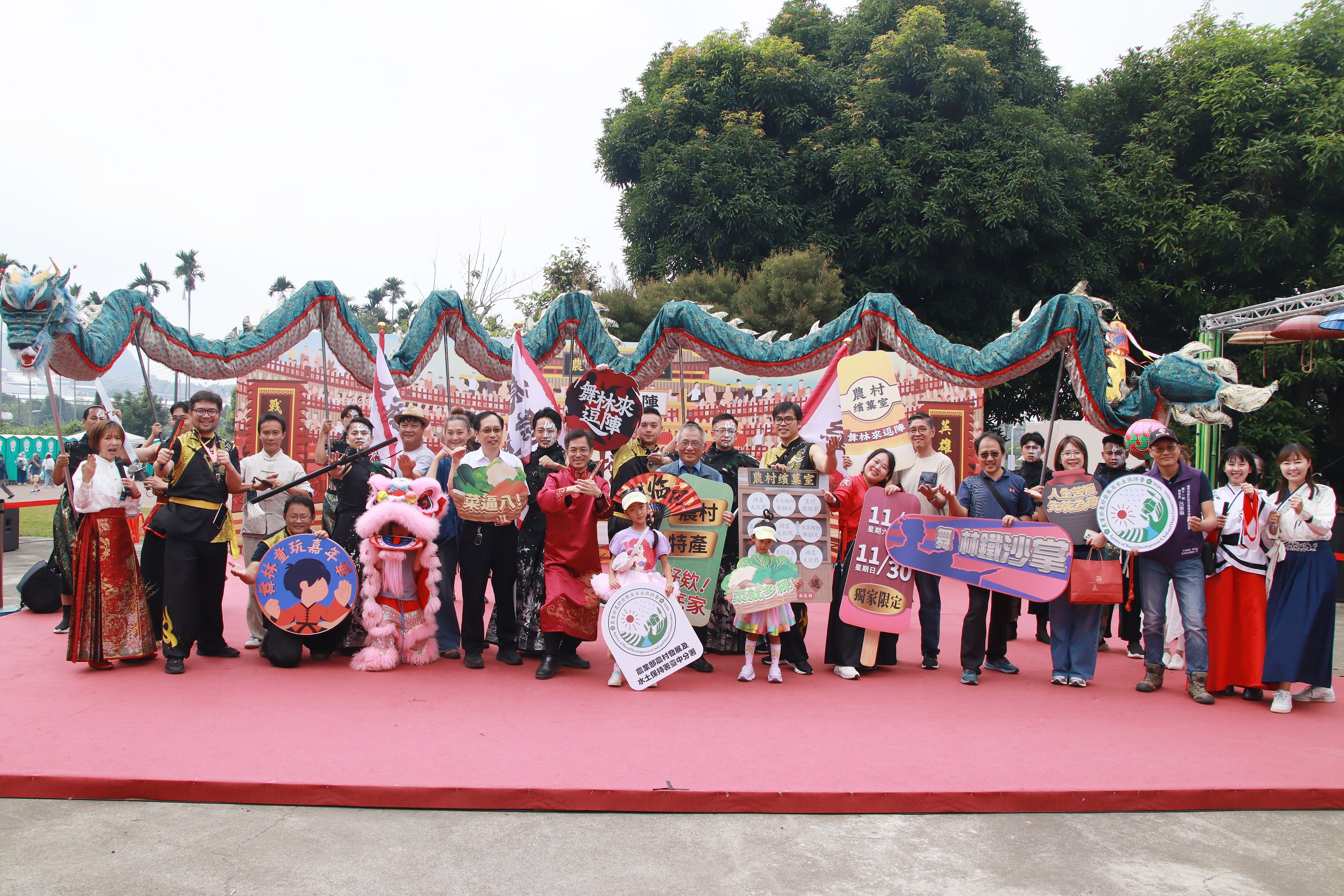 2025新社花海暨臺中國際花毯節(8)日在臺中新社熱鬧登場!由農業部農村發展及水土保持署臺中分署打造的亮點主題館《農村繽菓室-舞林來逗陣!》正式登場。今年以「武林 × 舞林 × 有恁」為主題,融合農村文化與江湖創意,邀請全民走進花海、體驗俠氣滿滿的農村新風華。