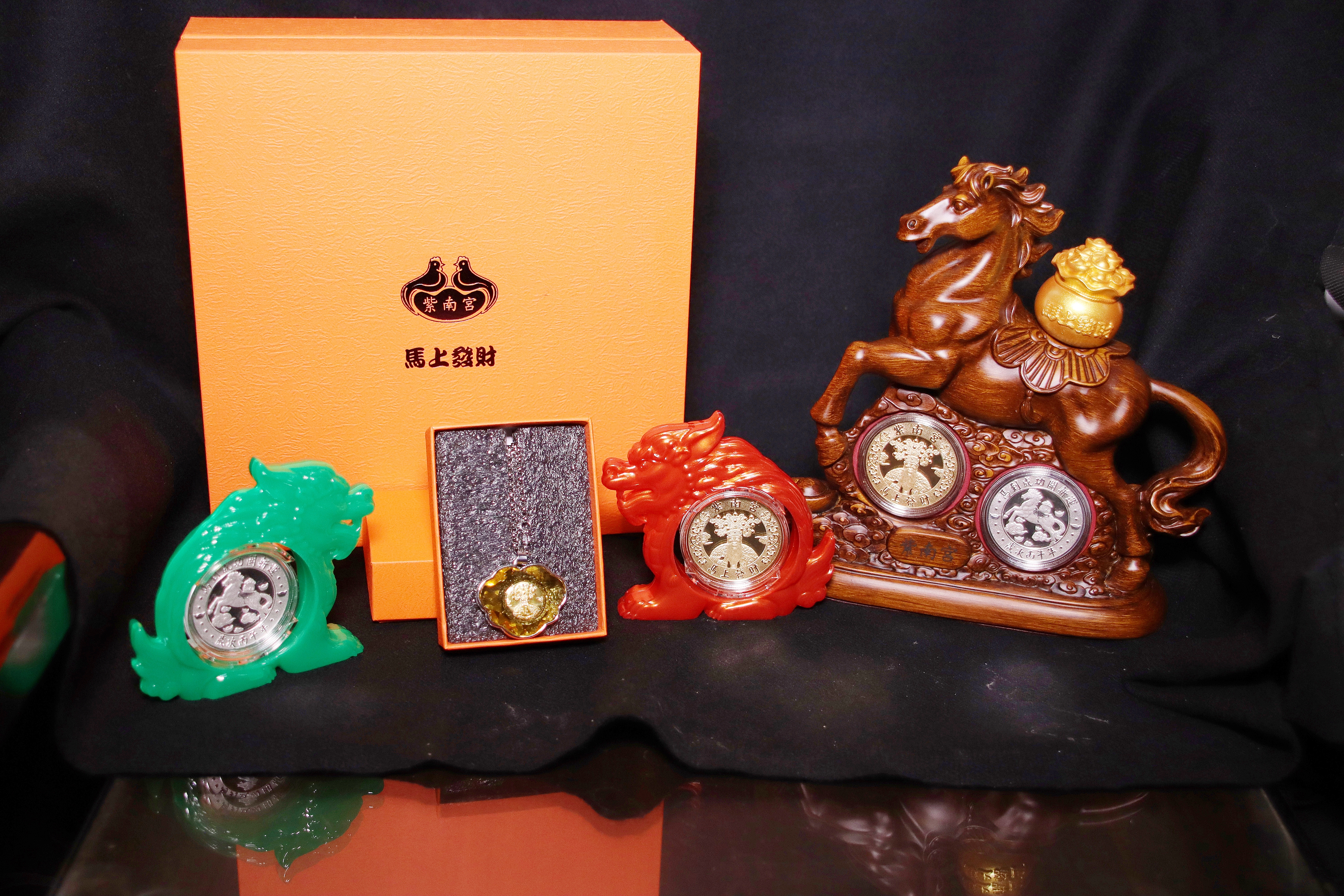 竹山鎮紫南宮今天發表丙午馬年錢母,分為單枚金幣、銀幣及精裝金銀套幣,馬年套幣展示座設計為駿馬奔騰背著黃金聚寶盆,寓意「馬上發財、財運奔騰」,錢母雙面刻有土地公神像及文字「馬到成功開新運」,外盒設計更是「致敬」國際品牌的經典橘色。每組金銀錢母,一紅一綠雙貔貅,另一面是馬到成功圖,今年也有錢母項鍊,紫南宮主委莊秋安:「單顆的有金銀,我們今年就是用貔貅,貔貅就是大家都喜歡嘛,貔貅就是說只入不出,大家賺錢全都會守住。」
