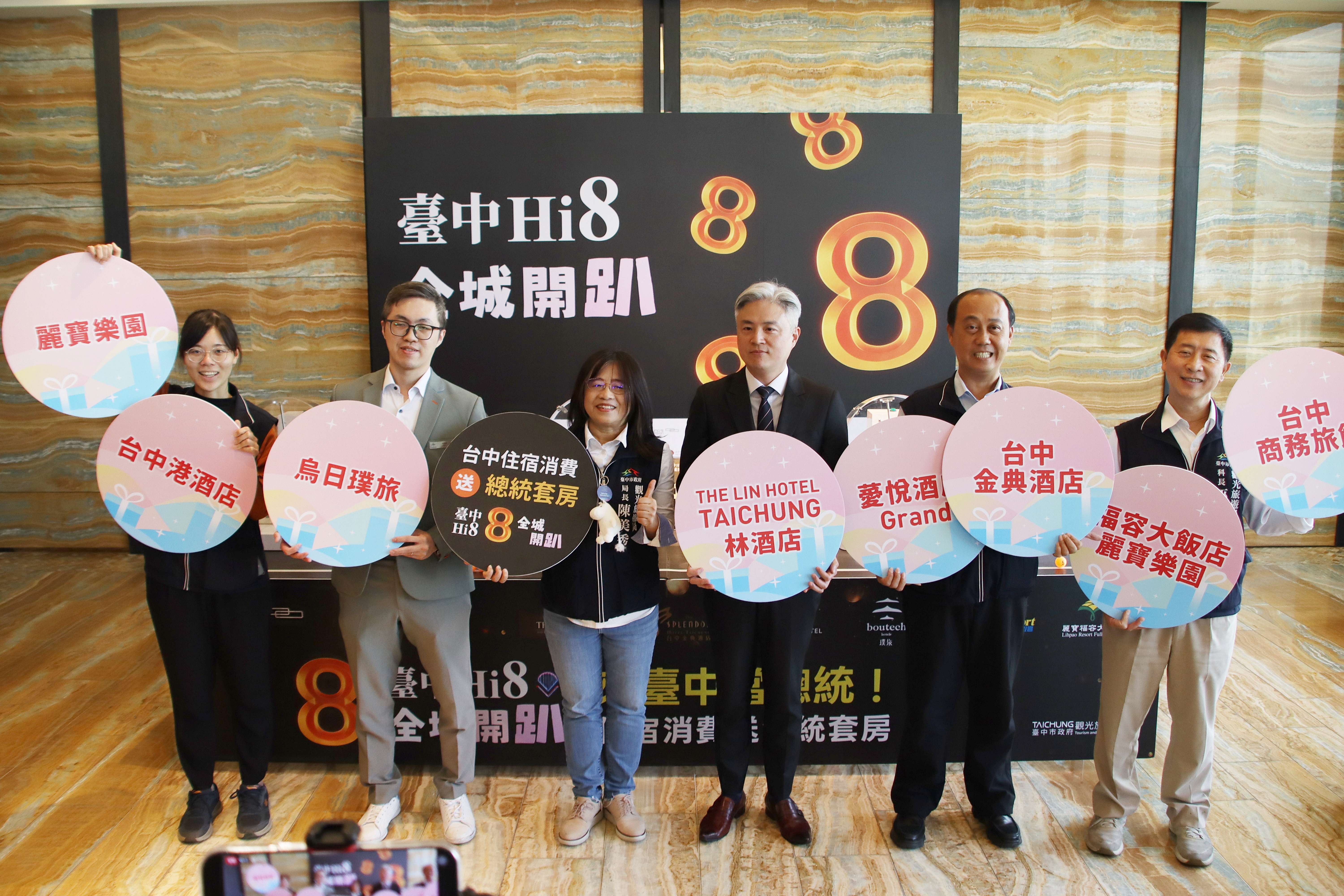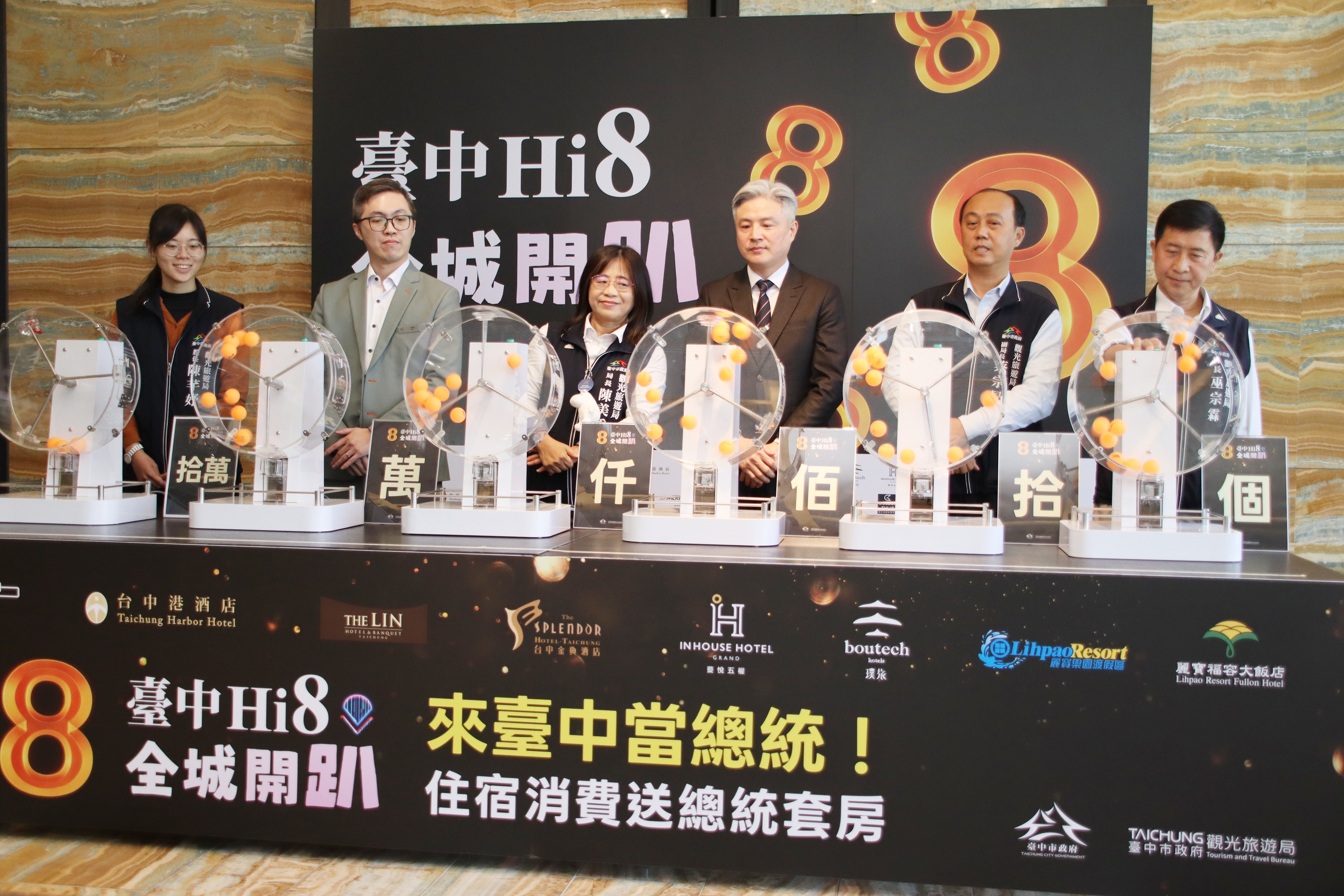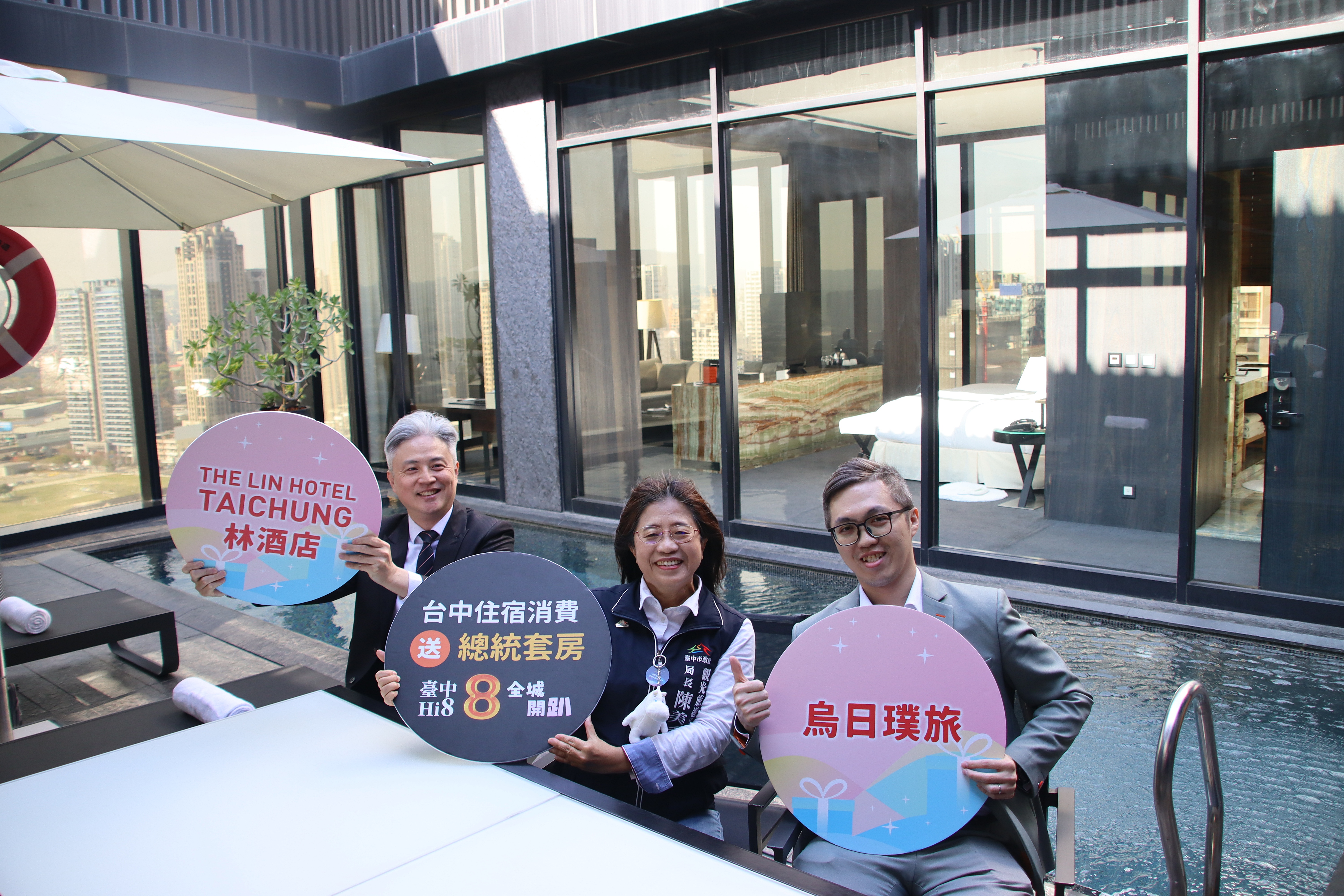 台中市政府觀光旅遊局持續推動「台中Hi8 全城開趴」系列活動,深受民眾關注的住宿行銷方案「來台中當總統-住宿消費抽總統套房」邁入第3場抽獎活動,今(28)日在林酒店由觀旅局長陳美秀、台中林酒店代表及烏日璞旅代表出席抽獎儀式,邀請民眾透過實際入住台中優質旅宿、登錄消費發票,以總統級視角體驗台中城市魅力。
