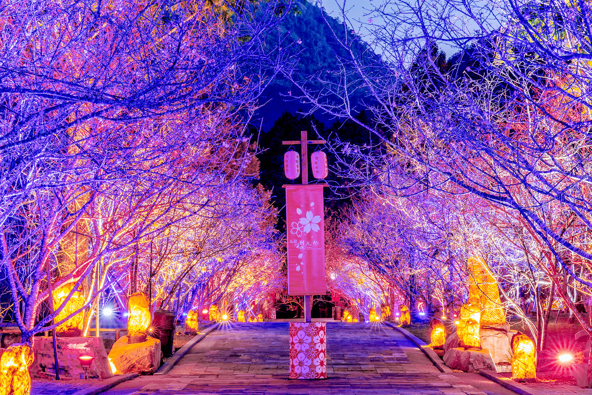 廣受好評的九族文化村「夜櫻」夜間賞櫻活動,2026年開放日期為2月14日至3月8日,園區開放時段將延長至 19:30(2/16除夕,營業時間至15:00)。夜櫻開放期間,園區將點亮幸福燈光,提供民眾夜間賞櫻的體驗,而最受矚目的「夜舞祭」也將壓軸登場,舞者隨著火龍在黑夜中交織舞動,將祭典氛圍推至頂點,為遊客留下一個難忘的回憶。