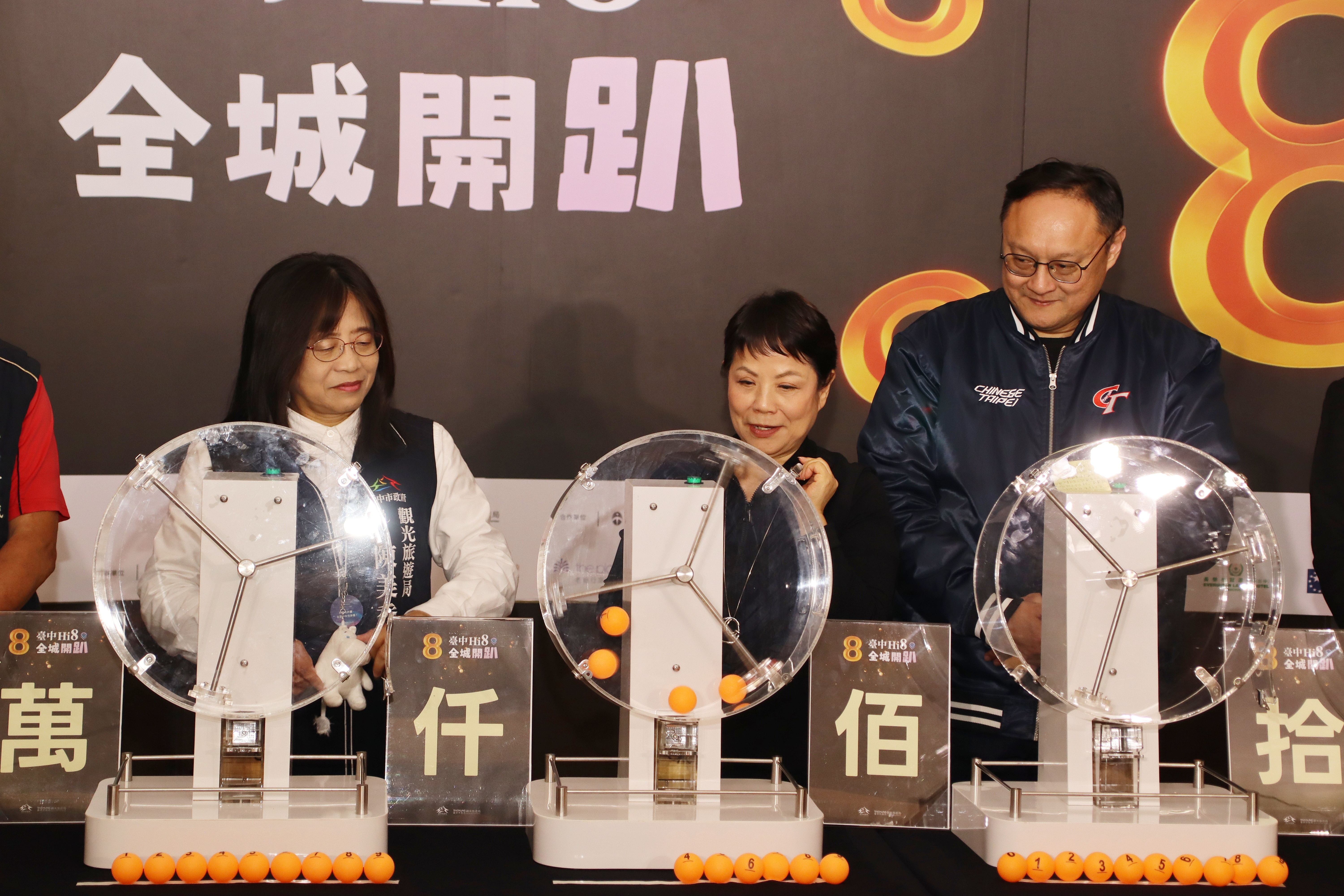 台中市觀旅局積極推動「台中Hi8 全城開趴」系列活動,今(9)日於金典酒店舉行「來台中當總統」最終場抽獎儀式,由副市長鄭照新等貴賓抽出 2 名總統套房得主。鄭副市長表示,在「台中Hi8全城開趴」氛圍與即將登場的中台灣燈會強大號召下,目前台中各大旅館的春節(2/14-2/21)平均訂房率已近6成並持續攀升中,數據六都第一!將台中旅遊熱度自去年底延伸至新春假期。
