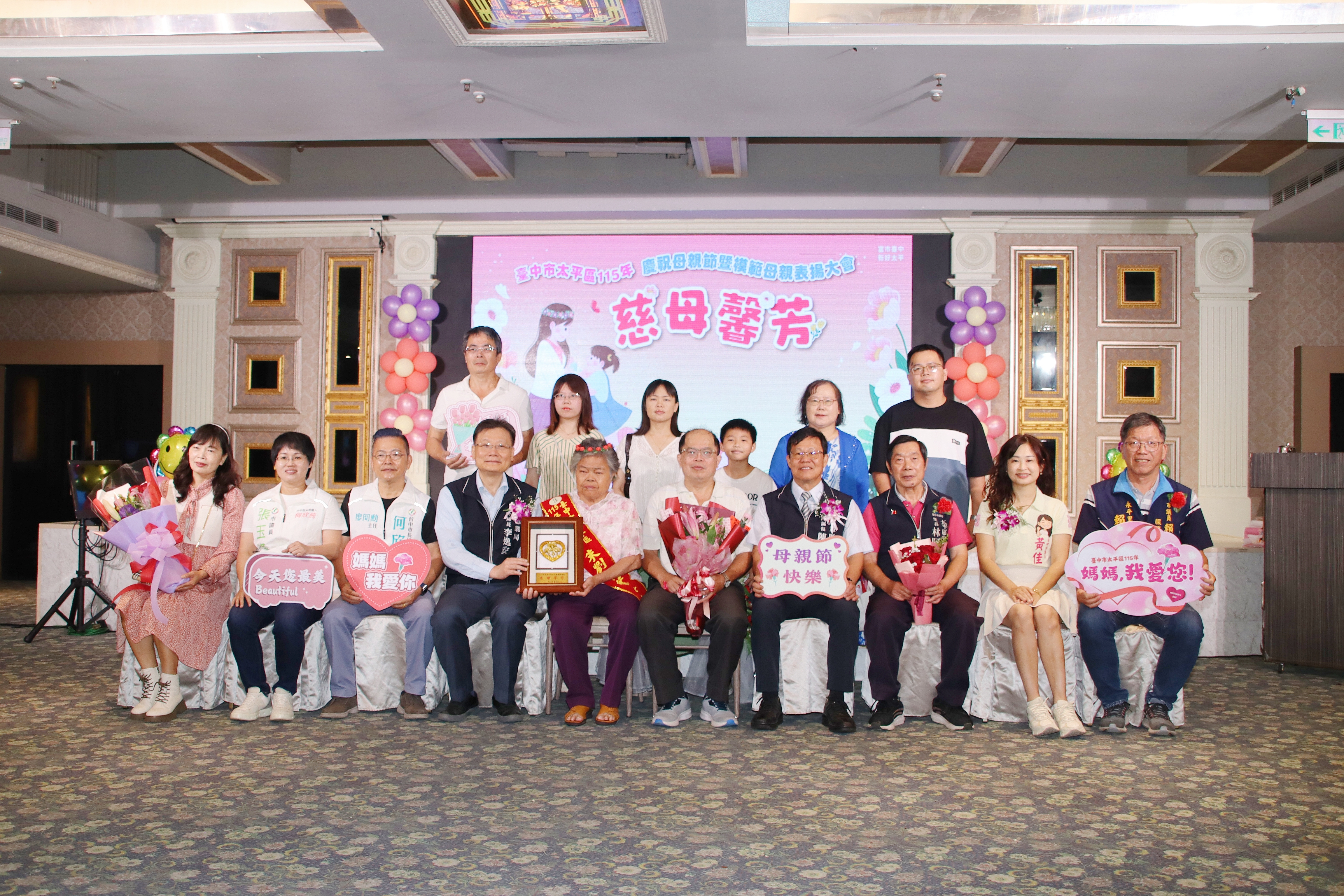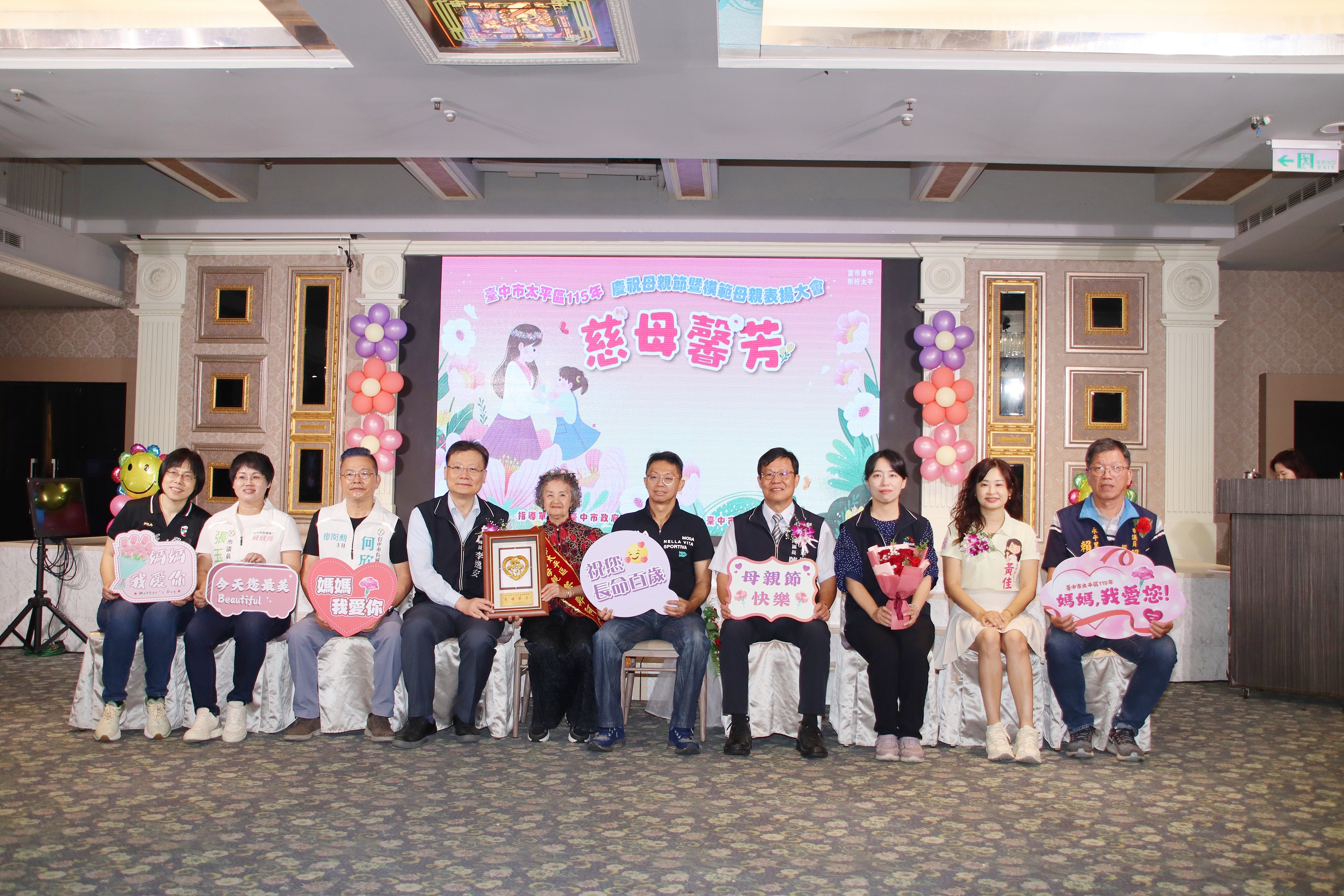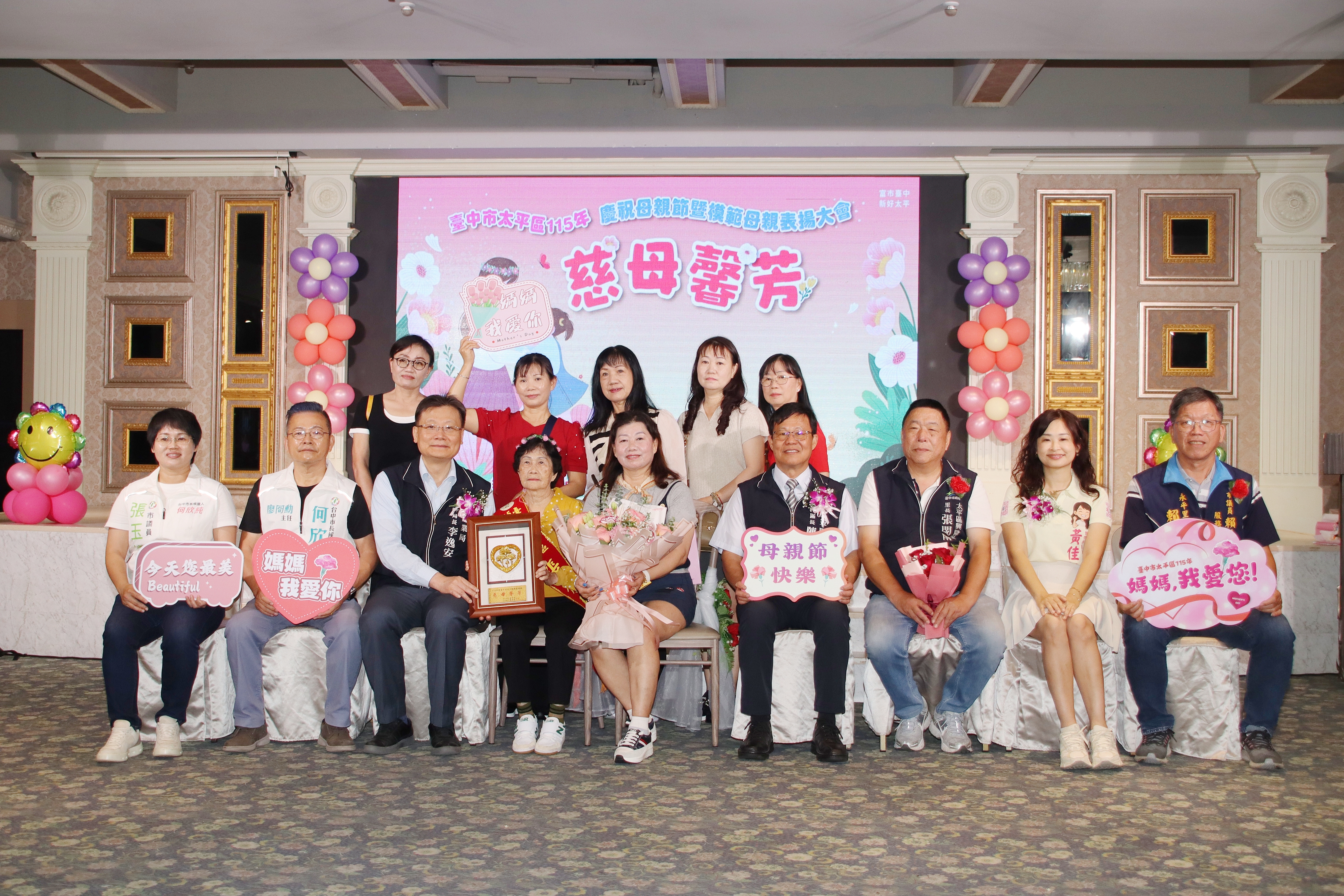 台中市太平區公所慶祝母親節特別在母親節前夕舉辦,慈母馨芳〜愛在太平活動,為感謝堅毅、無私奉獻的媽媽,太平區公所於今(115)年4月12日上午9時30分在新天地餐廳(東區店)設宴舉辦,邀請46位模範母親及家屬,齊聚一堂慶祝母親節。來自各里里長、立委及議員皆到場祝賀,氣氛溫馨熱鬧。